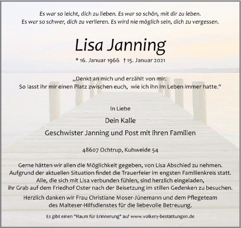 Hier finden Sie alle Traueranzeigen aus der Zeitung, die bisher für Lisa Janning erschienen sind. Weitere Traueranzeigen, die in der Zeitung erscheinen, werden hier ebenfalls aufgelistet