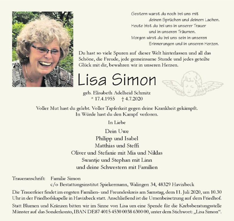 Hier finden Sie alle Traueranzeigen aus der Zeitung, die bisher für Lisa Simon erschienen sind. Weitere Traueranzeigen, die in der Zeitung erscheinen, werden hier ebenfalls aufgelistet