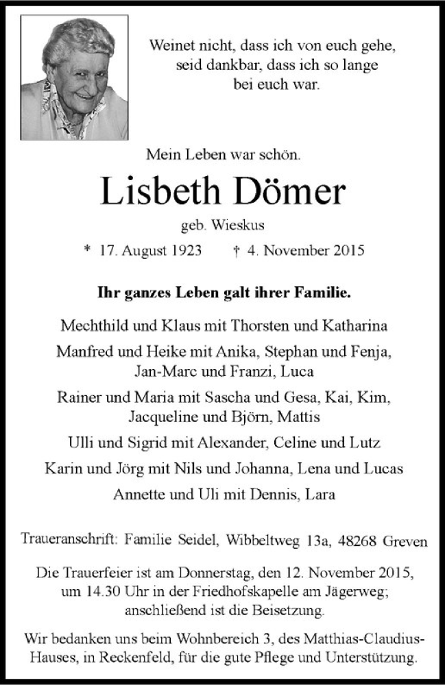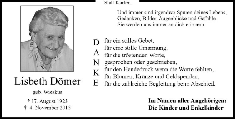 Hier finden Sie alle Traueranzeigen aus der Zeitung, die bisher für Lisbeth Dömer erschienen sind. Weitere Traueranzeigen, die in der Zeitung erscheinen, werden hier ebenfalls aufgelistet