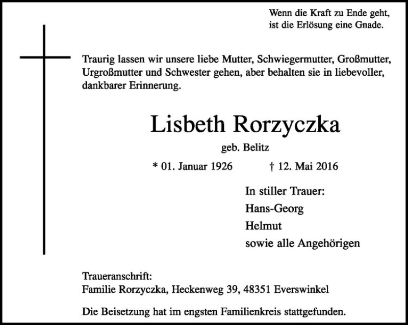 Hier finden Sie alle Traueranzeigen aus der Zeitung, die bisher für Lisbeth Rorzyczka erschienen sind. Weitere Traueranzeigen, die in der Zeitung erscheinen, werden hier ebenfalls aufgelistet