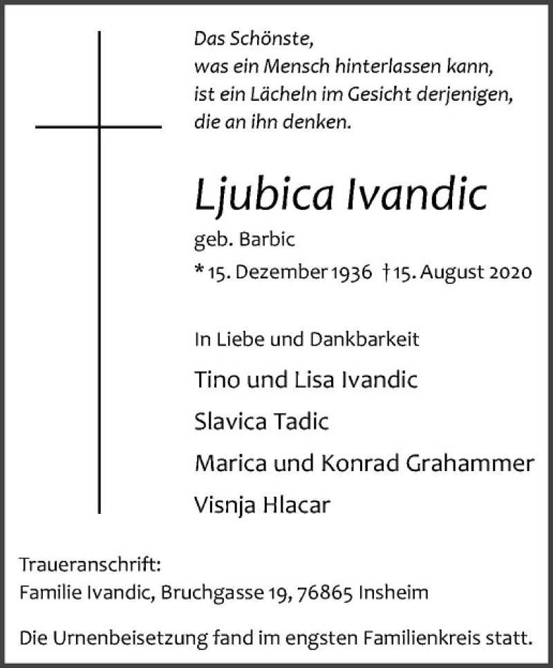 Hier finden Sie alle Traueranzeigen aus der Zeitung, die bisher für Ljubica Ivandic erschienen sind. Weitere Traueranzeigen, die in der Zeitung erscheinen, werden hier ebenfalls aufgelistet