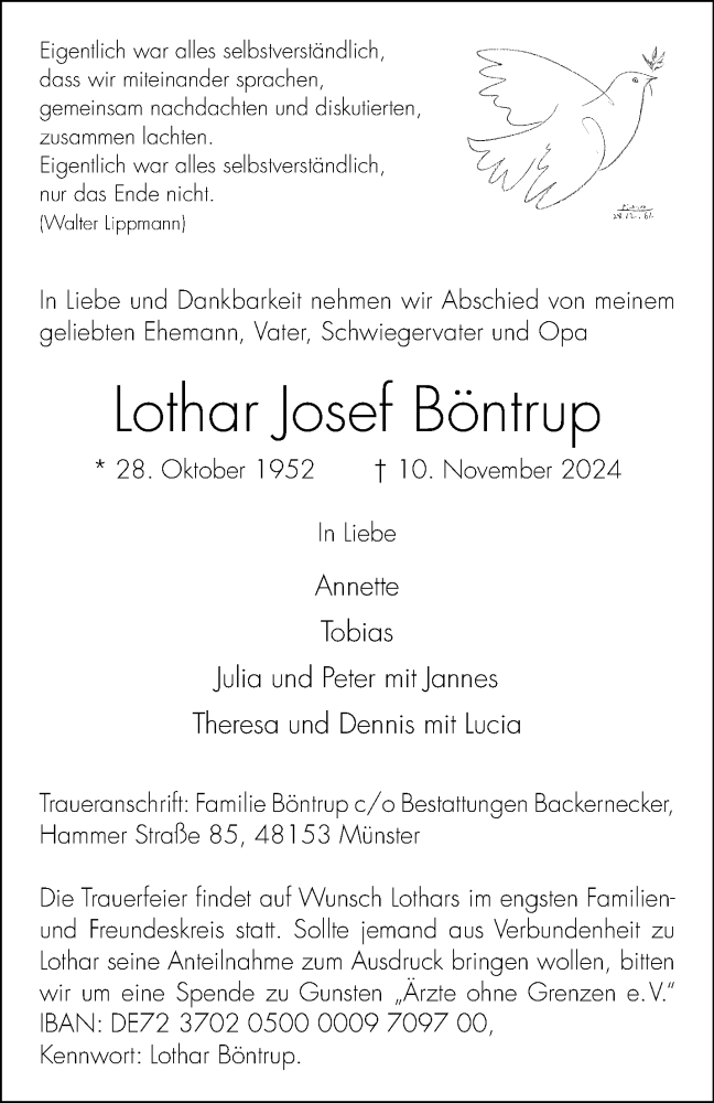 Hier finden Sie alle Traueranzeigen aus der Zeitung, die bisher für Lothar Josef Böntrup erschienen sind. Weitere Traueranzeigen, die in der Zeitung erscheinen, werden hier ebenfalls aufgelistet