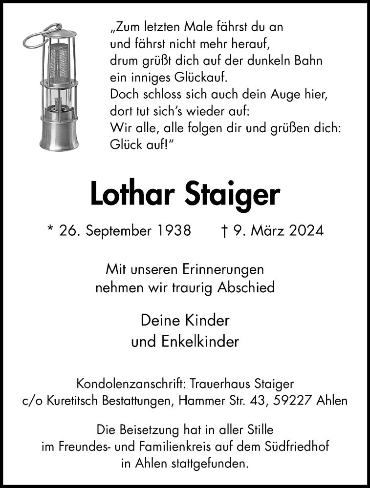 Hier finden Sie alle Traueranzeigen aus der Zeitung, die bisher für Lothar Staiger erschienen sind. Weitere Traueranzeigen, die in der Zeitung erscheinen, werden hier ebenfalls aufgelistet