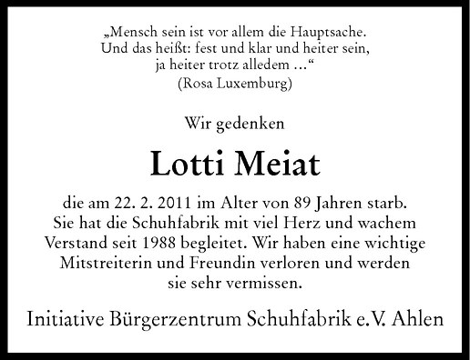 Hier finden Sie alle Traueranzeigen aus der Zeitung, die bisher für Lotti Meiat erschienen sind. Weitere Traueranzeigen, die in der Zeitung erscheinen, werden hier ebenfalls aufgelistet
