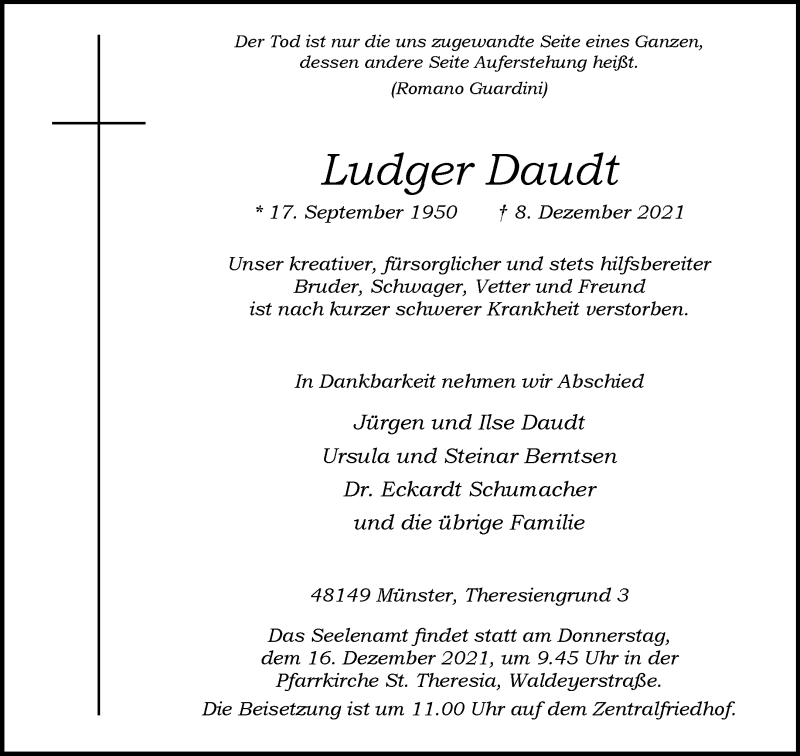 Hier finden Sie alle Traueranzeigen aus der Zeitung, die bisher für Ludger Daudt erschienen sind. Weitere Traueranzeigen, die in der Zeitung erscheinen, werden hier ebenfalls aufgelistet