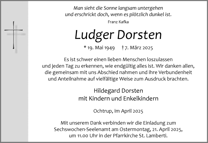 Hier finden Sie alle Traueranzeigen aus der Zeitung, die bisher für Ludger Dorsten erschienen sind. Weitere Traueranzeigen, die in der Zeitung erscheinen, werden hier ebenfalls aufgelistet