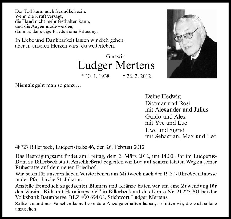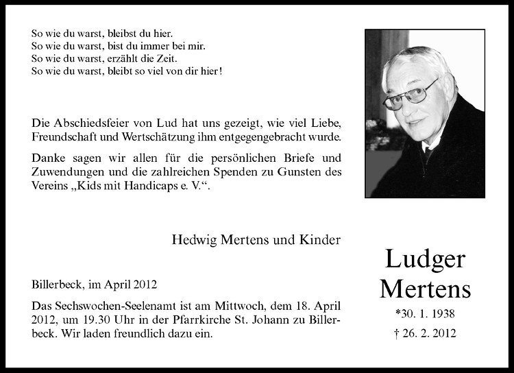 Hier finden Sie alle Traueranzeigen aus der Zeitung, die bisher für Ludger Mertens erschienen sind. Weitere Traueranzeigen, die in der Zeitung erscheinen, werden hier ebenfalls aufgelistet