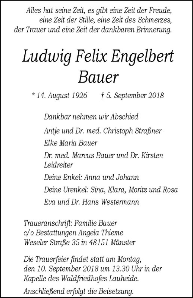 Hier finden Sie alle Traueranzeigen aus der Zeitung, die bisher für Ludwig Felix Engelbert Bauer erschienen sind. Weitere Traueranzeigen, die in der Zeitung erscheinen, werden hier ebenfalls aufgelistet