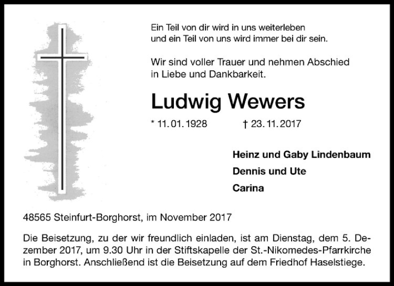Hier finden Sie alle Traueranzeigen aus der Zeitung, die bisher für Ludwig Wewers erschienen sind. Weitere Traueranzeigen, die in der Zeitung erscheinen, werden hier ebenfalls aufgelistet