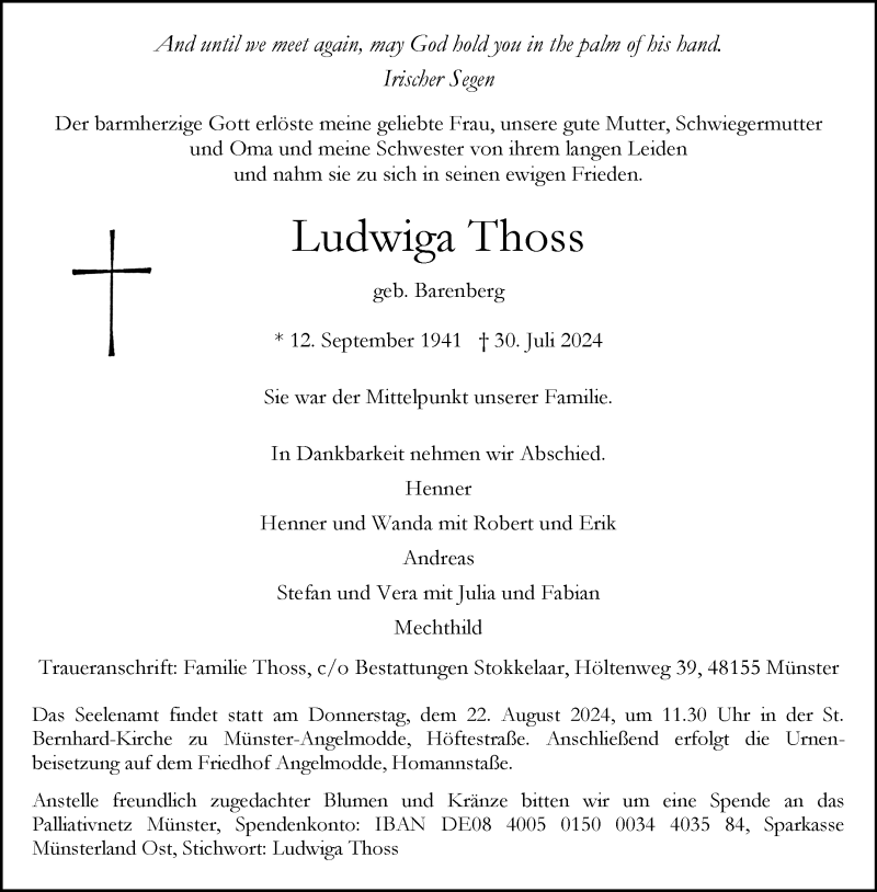 Hier finden Sie alle Traueranzeigen aus der Zeitung, die bisher für Ludwiga Thoss erschienen sind. Weitere Traueranzeigen, die in der Zeitung erscheinen, werden hier ebenfalls aufgelistet