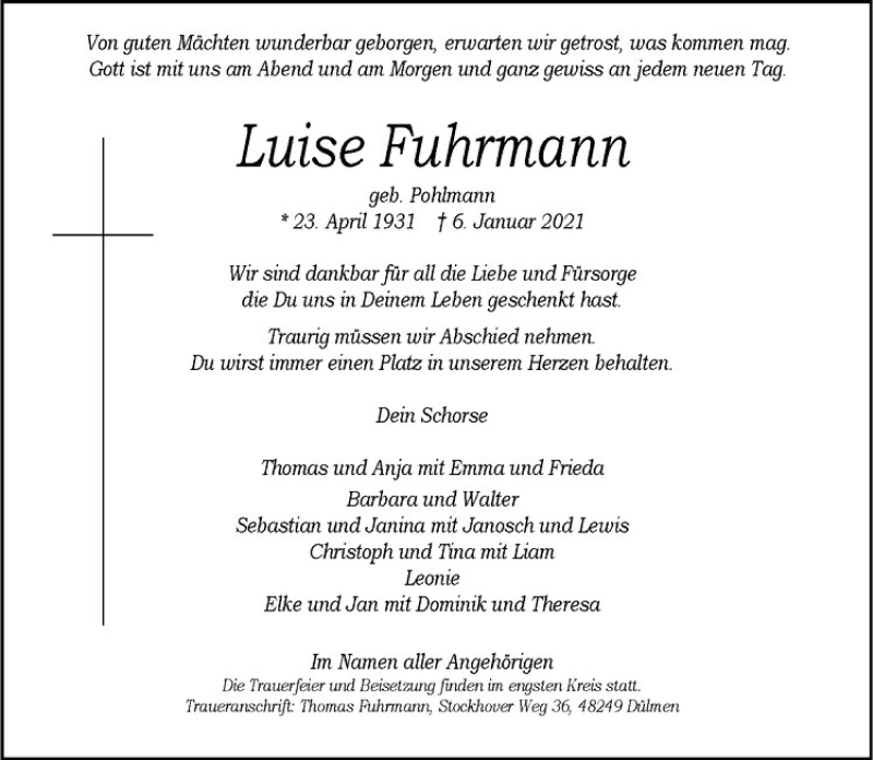 Hier finden Sie alle Traueranzeigen aus der Zeitung, die bisher für Luise Fuhrmann erschienen sind. Weitere Traueranzeigen, die in der Zeitung erscheinen, werden hier ebenfalls aufgelistet