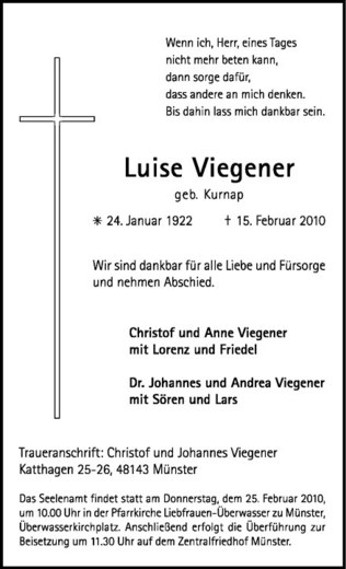 Hier finden Sie alle Traueranzeigen aus der Zeitung, die bisher für Luise Viegener erschienen sind. Weitere Traueranzeigen, die in der Zeitung erscheinen, werden hier ebenfalls aufgelistet