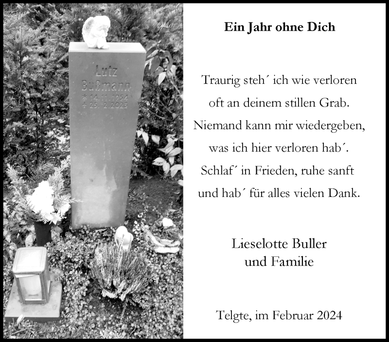 Hier finden Sie alle Traueranzeigen aus der Zeitung, die bisher für Lutz Bußmann erschienen sind. Weitere Traueranzeigen, die in der Zeitung erscheinen, werden hier ebenfalls aufgelistet