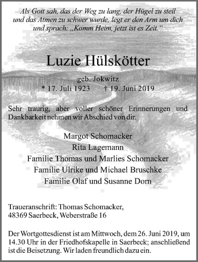 Hier finden Sie alle Traueranzeigen aus der Zeitung, die bisher für Luzie Hülskötter erschienen sind. Weitere Traueranzeigen, die in der Zeitung erscheinen, werden hier ebenfalls aufgelistet