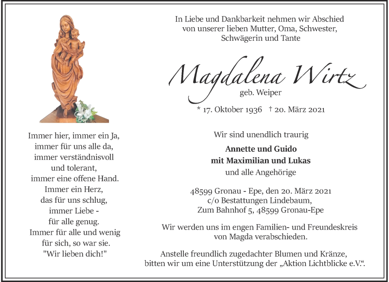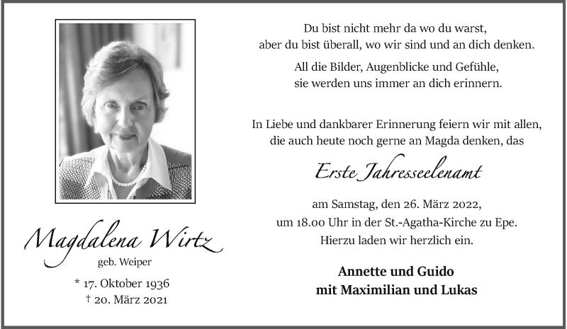 Hier finden Sie alle Traueranzeigen aus der Zeitung, die bisher für Magdalena Wirtz erschienen sind. Weitere Traueranzeigen, die in der Zeitung erscheinen, werden hier ebenfalls aufgelistet
