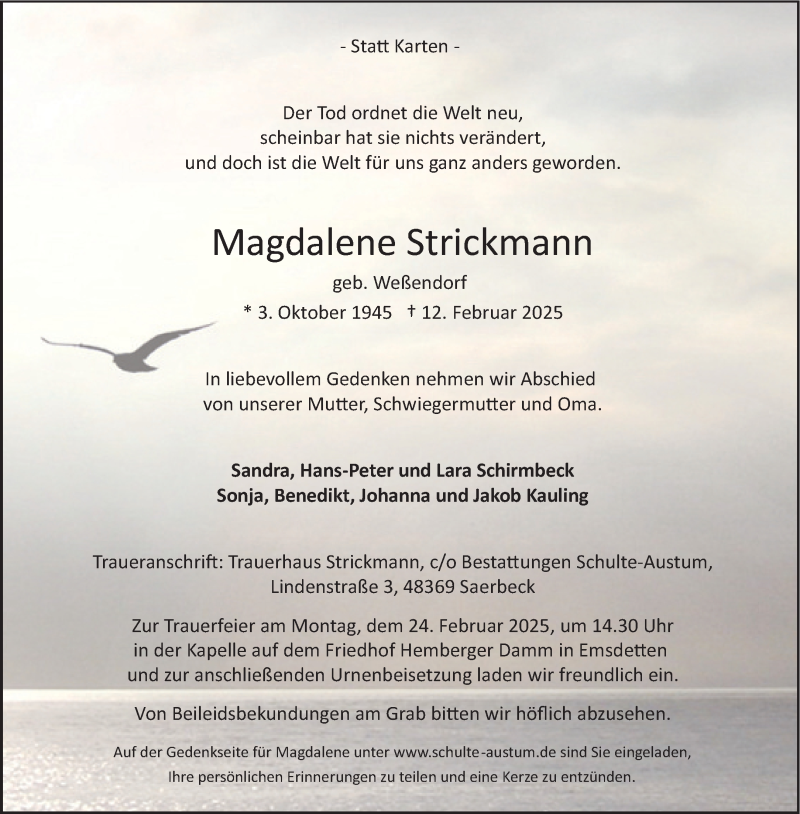 Hier finden Sie alle Traueranzeigen aus der Zeitung, die bisher für Magdalene Strickmann erschienen sind. Weitere Traueranzeigen, die in der Zeitung erscheinen, werden hier ebenfalls aufgelistet