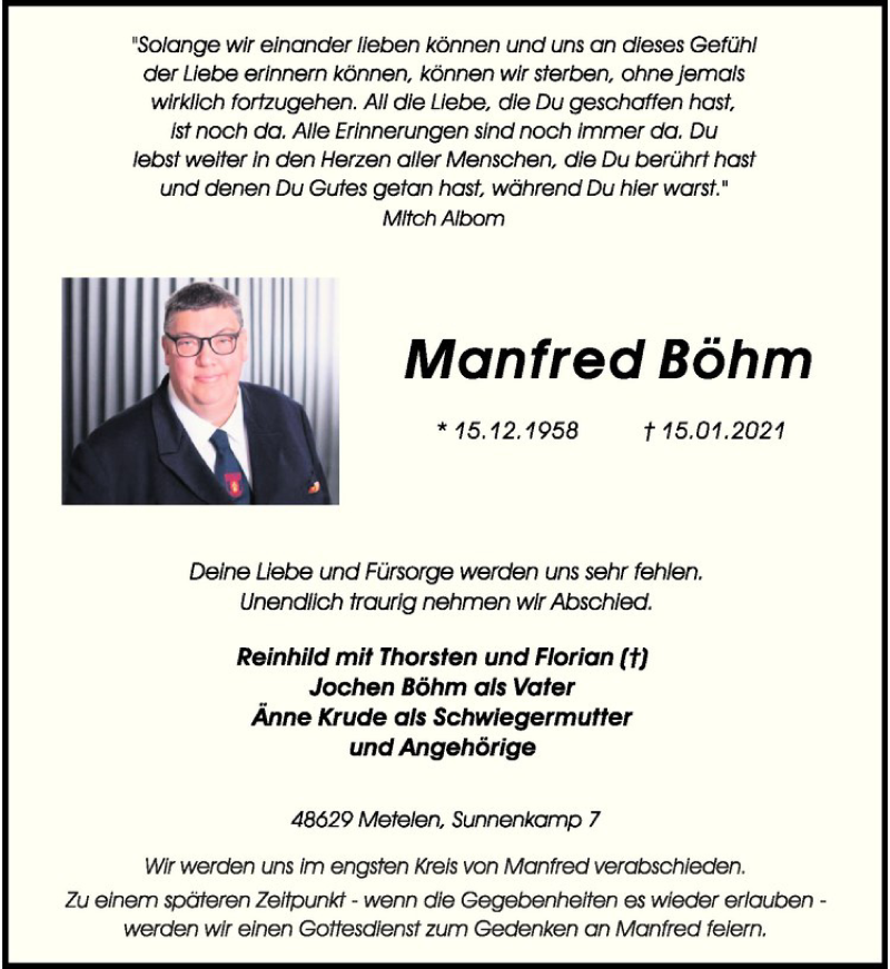 Hier finden Sie alle Traueranzeigen aus der Zeitung, die bisher für Florian Böhm erschienen sind. Weitere Traueranzeigen, die in der Zeitung erscheinen, werden hier ebenfalls aufgelistet