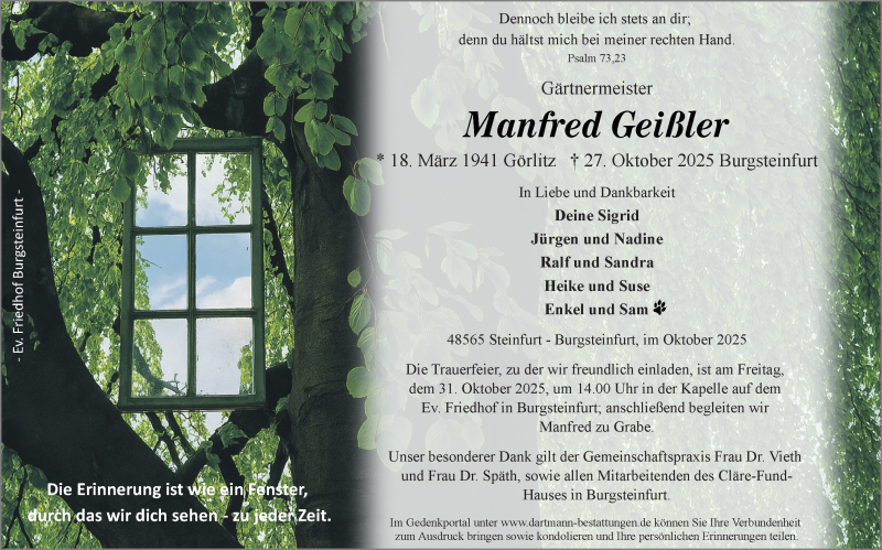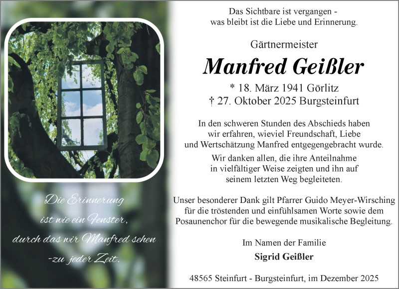Hier finden Sie alle Traueranzeigen aus der Zeitung, die bisher für Manfred Geißler erschienen sind. Weitere Traueranzeigen, die in der Zeitung erscheinen, werden hier ebenfalls aufgelistet
