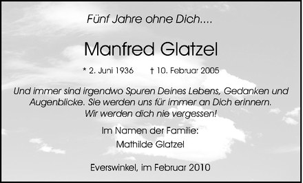 Hier finden Sie alle Traueranzeigen aus der Zeitung, die bisher für Manfred Glatzel erschienen sind. Weitere Traueranzeigen, die in der Zeitung erscheinen, werden hier ebenfalls aufgelistet
