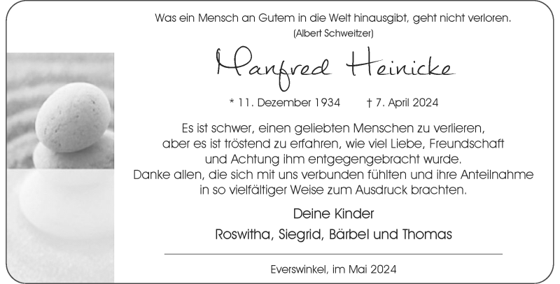 Hier finden Sie alle Traueranzeigen aus der Zeitung, die bisher für Manfred Heinicke erschienen sind. Weitere Traueranzeigen, die in der Zeitung erscheinen, werden hier ebenfalls aufgelistet