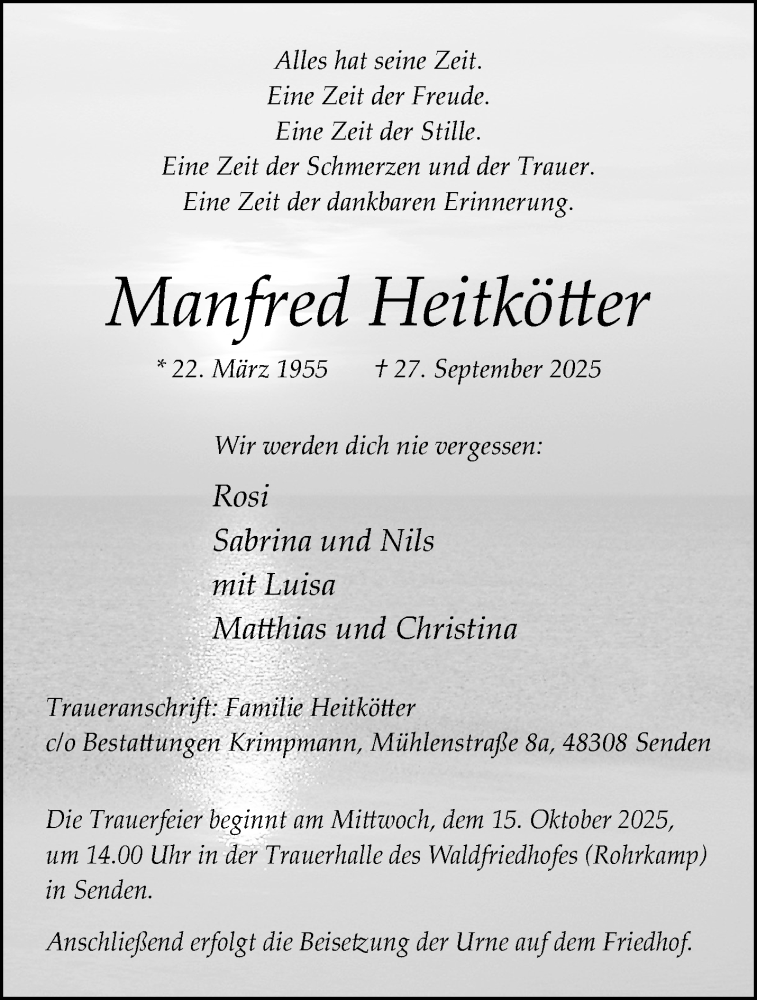 Hier finden Sie alle Traueranzeigen aus der Zeitung, die bisher für Manfred Heitkötter erschienen sind. Weitere Traueranzeigen, die in der Zeitung erscheinen, werden hier ebenfalls aufgelistet