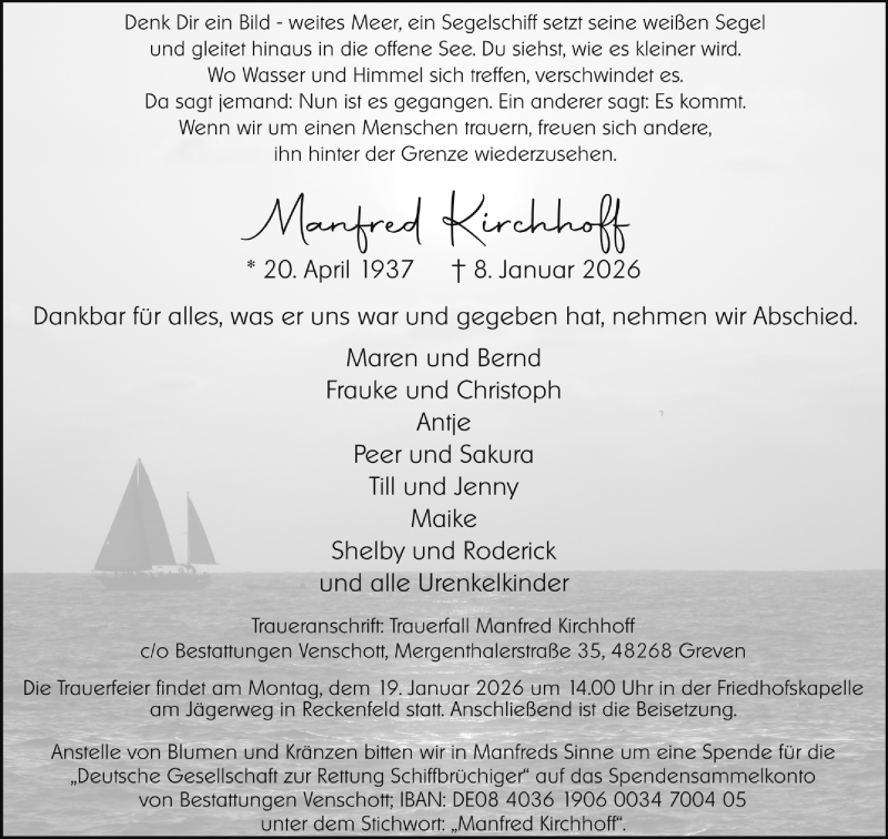 Hier finden Sie alle Traueranzeigen aus der Zeitung, die bisher für Manfred Kirchhoff erschienen sind. Weitere Traueranzeigen, die in der Zeitung erscheinen, werden hier ebenfalls aufgelistet