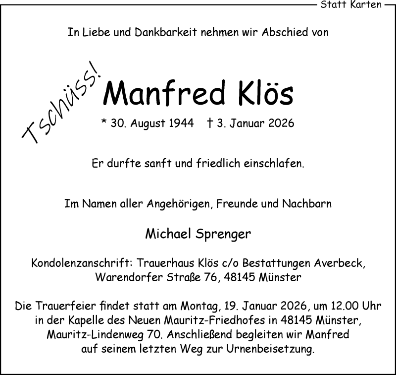 Hier finden Sie alle Traueranzeigen aus der Zeitung, die bisher für Manfred Klös erschienen sind. Weitere Traueranzeigen, die in der Zeitung erscheinen, werden hier ebenfalls aufgelistet