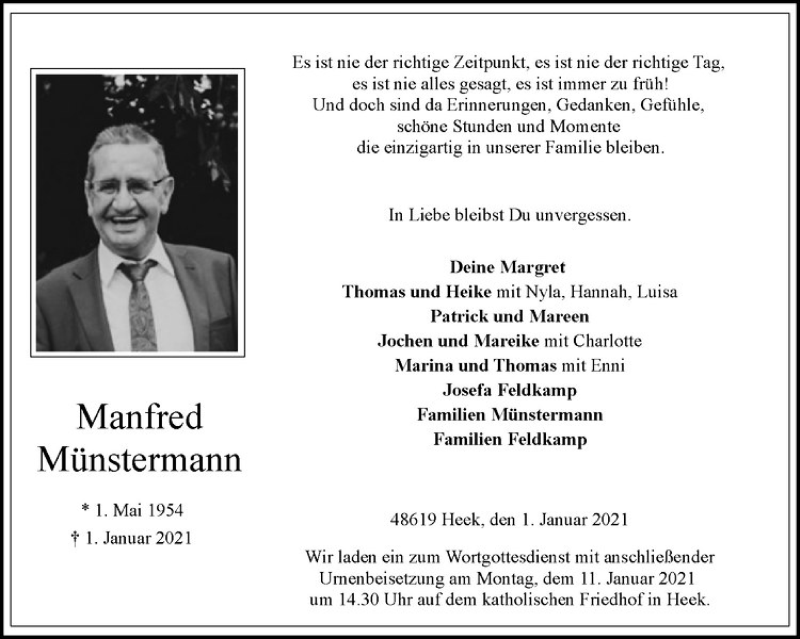 Hier finden Sie alle Traueranzeigen aus der Zeitung, die bisher für Manfred Münstermann erschienen sind. Weitere Traueranzeigen, die in der Zeitung erscheinen, werden hier ebenfalls aufgelistet