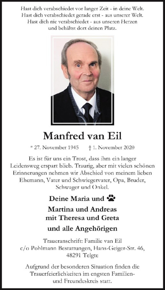 Hier finden Sie alle Traueranzeigen aus der Zeitung, die bisher für Manfred van Eil erschienen sind. Weitere Traueranzeigen, die in der Zeitung erscheinen, werden hier ebenfalls aufgelistet