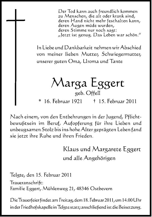 Hier finden Sie alle Traueranzeigen aus der Zeitung, die bisher für Marga Eggert erschienen sind. Weitere Traueranzeigen, die in der Zeitung erscheinen, werden hier ebenfalls aufgelistet