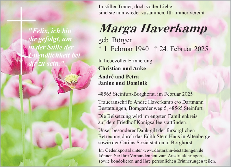 Hier finden Sie alle Traueranzeigen aus der Zeitung, die bisher für Marga Haverkamp erschienen sind. Weitere Traueranzeigen, die in der Zeitung erscheinen, werden hier ebenfalls aufgelistet