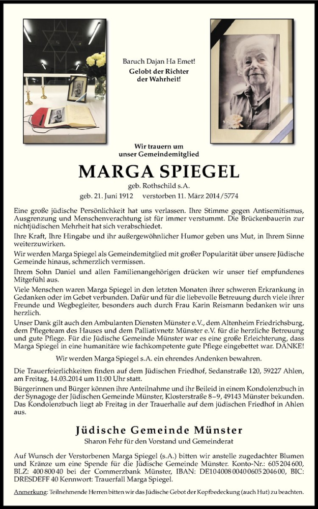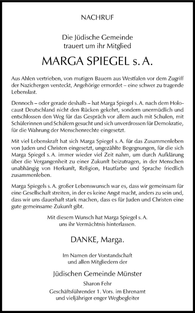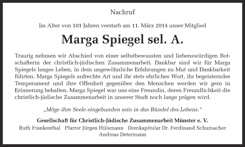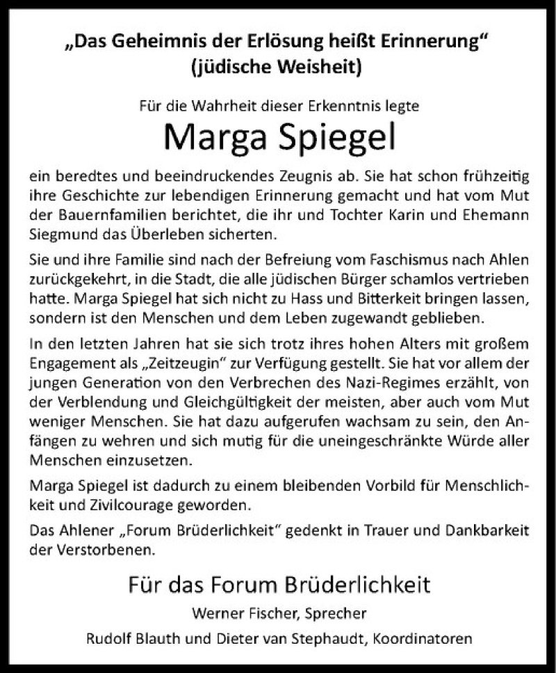 Hier finden Sie alle Traueranzeigen aus der Zeitung, die bisher für Marga Spiegel erschienen sind. Weitere Traueranzeigen, die in der Zeitung erscheinen, werden hier ebenfalls aufgelistet