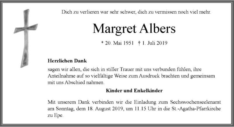 Hier finden Sie alle Traueranzeigen aus der Zeitung, die bisher für Margareta Albers erschienen sind. Weitere Traueranzeigen, die in der Zeitung erscheinen, werden hier ebenfalls aufgelistet