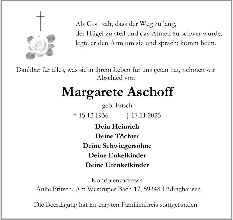 Hier finden Sie alle Traueranzeigen aus der Zeitung, die bisher für Margarete Aschoff erschienen sind. Weitere Traueranzeigen, die in der Zeitung erscheinen, werden hier ebenfalls aufgelistet
