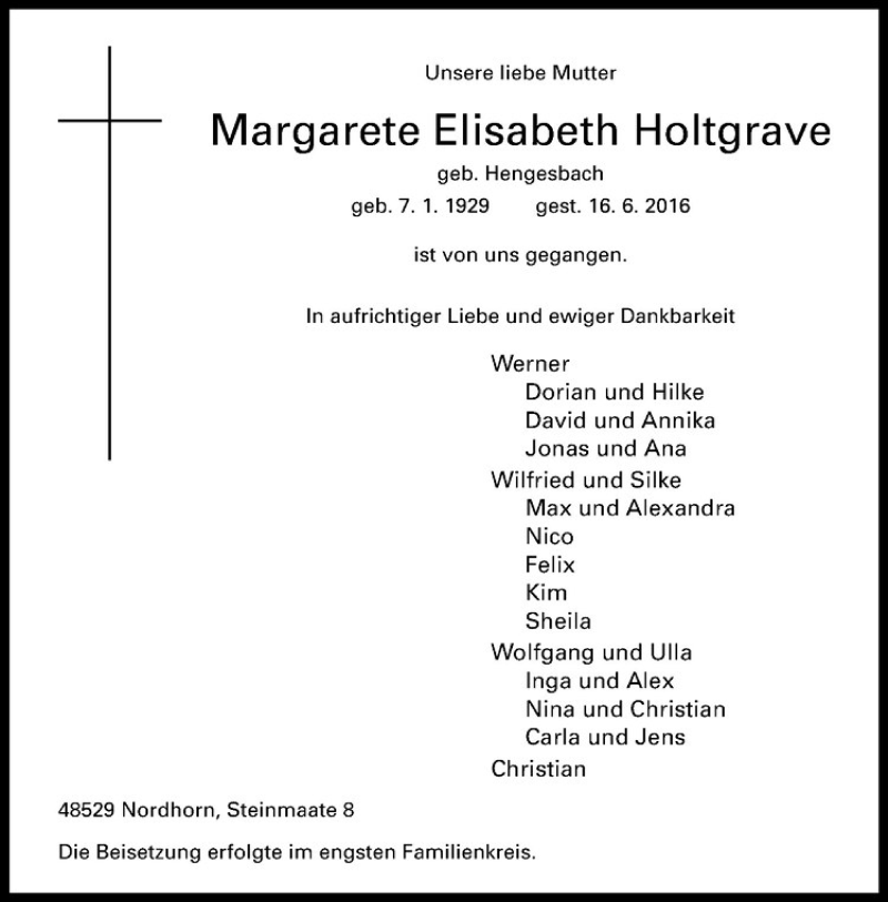 Hier finden Sie alle Traueranzeigen aus der Zeitung, die bisher für Margarete Elisabeth Holtgrave erschienen sind. Weitere Traueranzeigen, die in der Zeitung erscheinen, werden hier ebenfalls aufgelistet