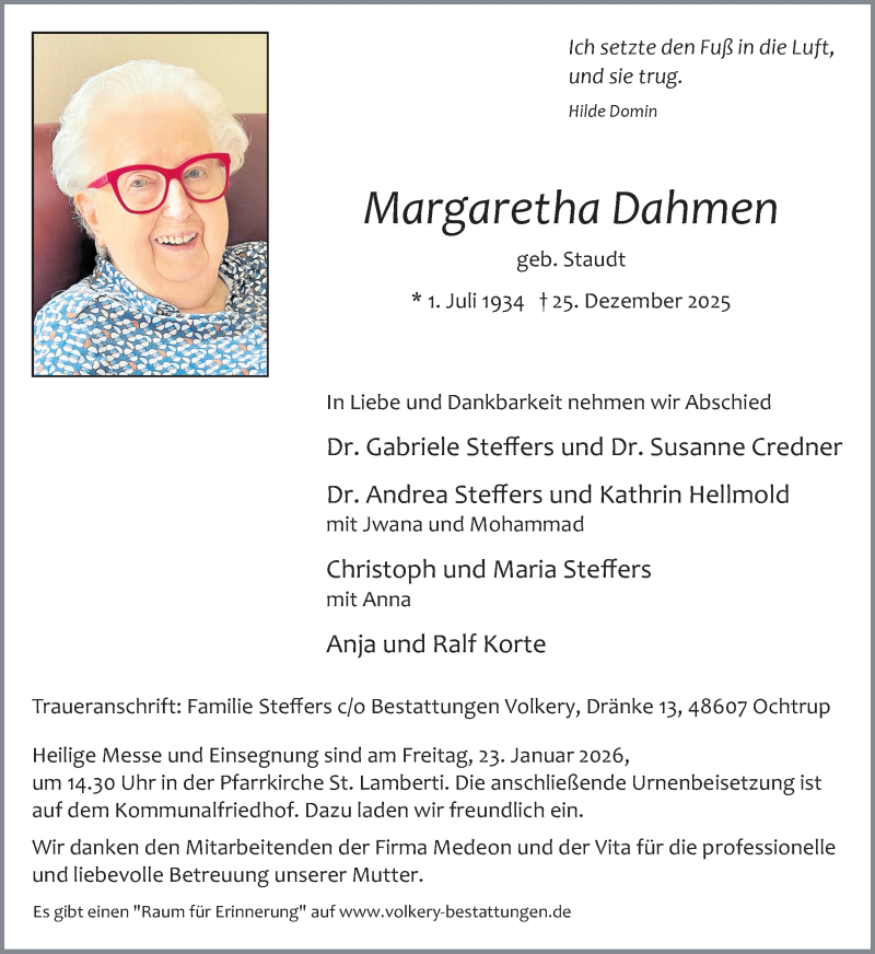 Hier finden Sie alle Traueranzeigen aus der Zeitung, die bisher für Margartha Dahmen erschienen sind. Weitere Traueranzeigen, die in der Zeitung erscheinen, werden hier ebenfalls aufgelistet