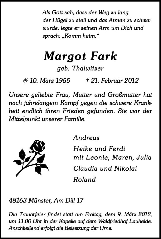 Hier finden Sie alle Traueranzeigen aus der Zeitung, die bisher für Margot Fark erschienen sind. Weitere Traueranzeigen, die in der Zeitung erscheinen, werden hier ebenfalls aufgelistet