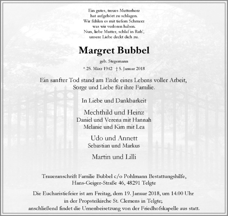 Hier finden Sie alle Traueranzeigen aus der Zeitung, die bisher für Margret Bubbel erschienen sind. Weitere Traueranzeigen, die in der Zeitung erscheinen, werden hier ebenfalls aufgelistet