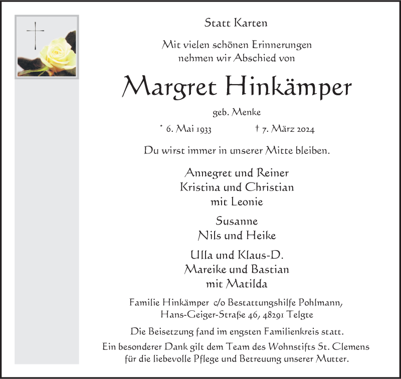 Hier finden Sie alle Traueranzeigen aus der Zeitung, die bisher für Margret Hinkämper erschienen sind. Weitere Traueranzeigen, die in der Zeitung erscheinen, werden hier ebenfalls aufgelistet