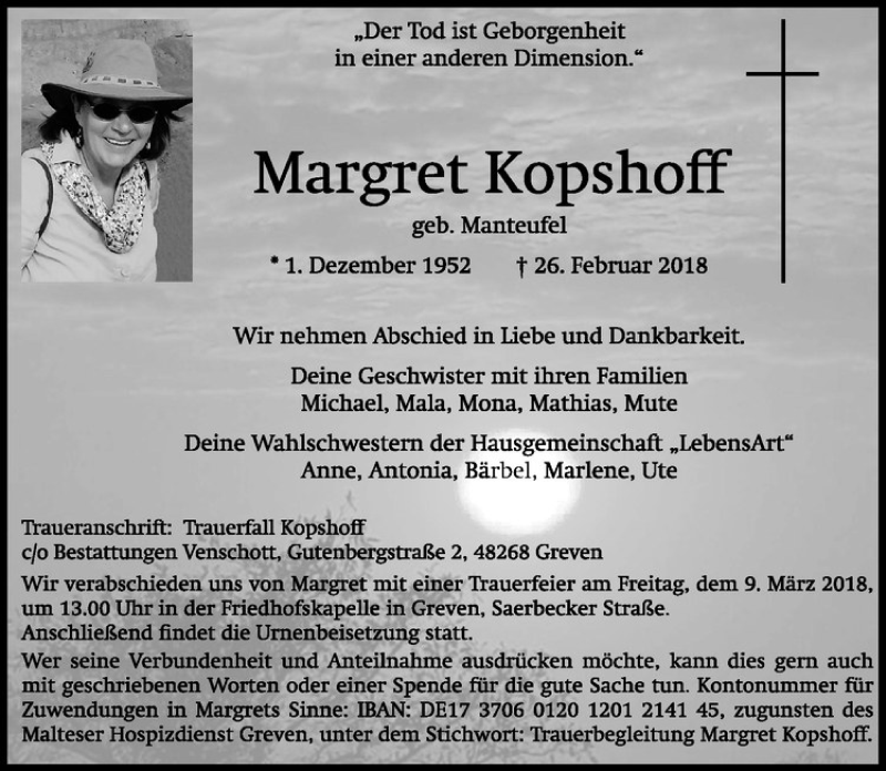 Hier finden Sie alle Traueranzeigen aus der Zeitung, die bisher für Margret Kopshoff erschienen sind. Weitere Traueranzeigen, die in der Zeitung erscheinen, werden hier ebenfalls aufgelistet