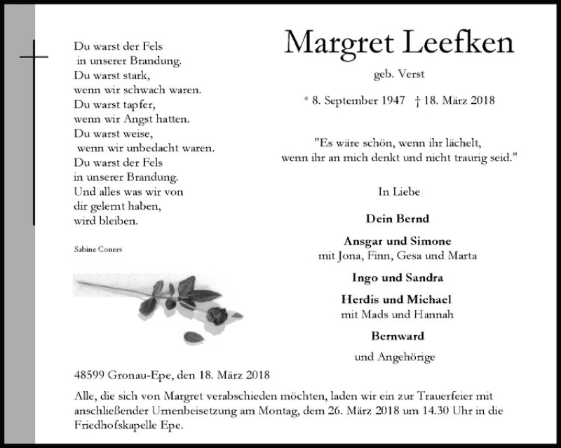 Hier finden Sie alle Traueranzeigen aus der Zeitung, die bisher für Margret Leefken erschienen sind. Weitere Traueranzeigen, die in der Zeitung erscheinen, werden hier ebenfalls aufgelistet