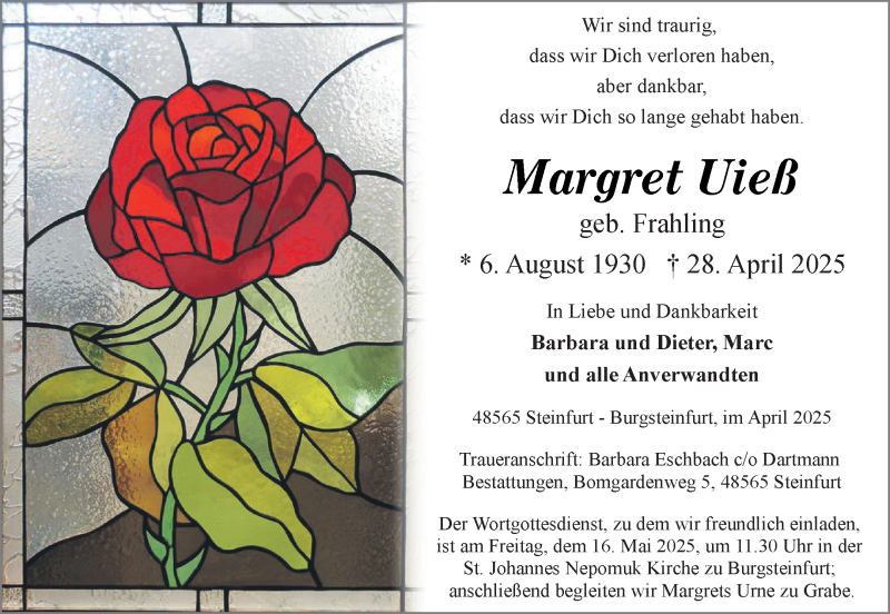 Hier finden Sie alle Traueranzeigen aus der Zeitung, die bisher für Margret Margret Uieß (geb. Frahling) erschienen sind. Weitere Traueranzeigen, die in der Zeitung erscheinen, werden hier ebenfalls aufgelistet