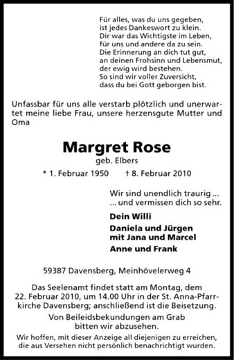 Hier finden Sie alle Traueranzeigen aus der Zeitung, die bisher für Margret Rose erschienen sind. Weitere Traueranzeigen, die in der Zeitung erscheinen, werden hier ebenfalls aufgelistet