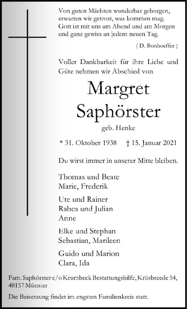 Hier finden Sie alle Traueranzeigen aus der Zeitung, die bisher für Margret Saphörster erschienen sind. Weitere Traueranzeigen, die in der Zeitung erscheinen, werden hier ebenfalls aufgelistet