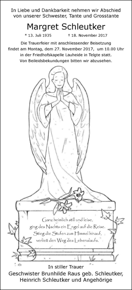 Hier finden Sie alle Traueranzeigen aus der Zeitung, die bisher für Margret Schleutker erschienen sind. Weitere Traueranzeigen, die in der Zeitung erscheinen, werden hier ebenfalls aufgelistet