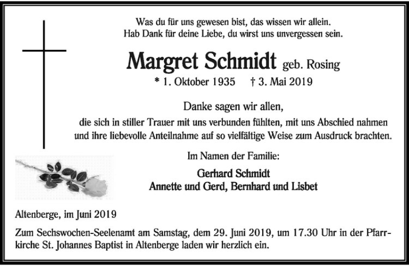 Hier finden Sie alle Traueranzeigen aus der Zeitung, die bisher für Margret Schmidt erschienen sind. Weitere Traueranzeigen, die in der Zeitung erscheinen, werden hier ebenfalls aufgelistet