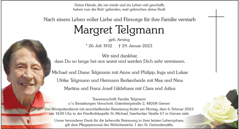 Hier finden Sie alle Traueranzeigen aus der Zeitung, die bisher für Margret Telgmann erschienen sind. Weitere Traueranzeigen, die in der Zeitung erscheinen, werden hier ebenfalls aufgelistet