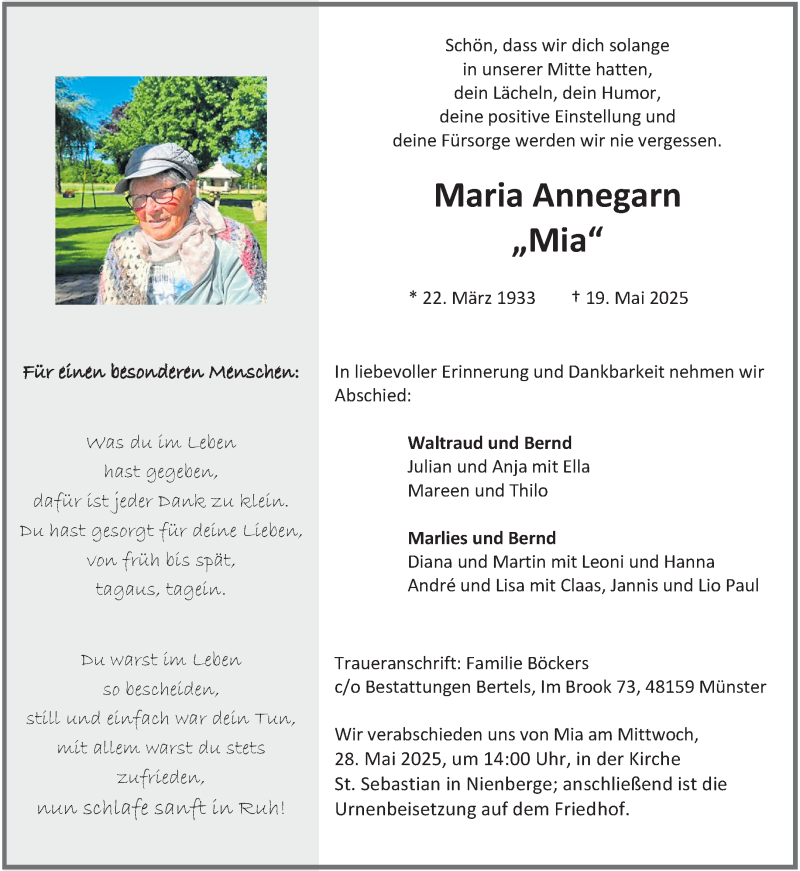 Hier finden Sie alle Traueranzeigen aus der Zeitung, die bisher für Maria Annegarn erschienen sind. Weitere Traueranzeigen, die in der Zeitung erscheinen, werden hier ebenfalls aufgelistet