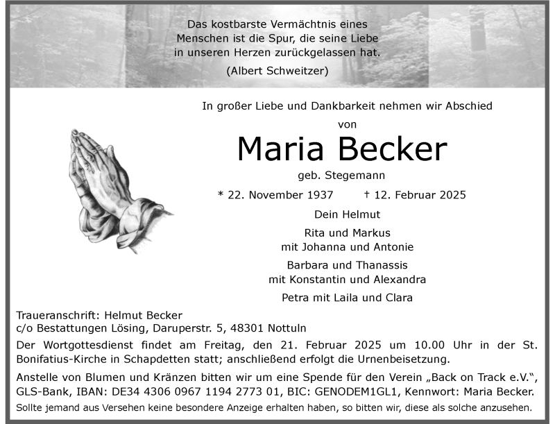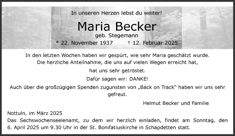 Hier finden Sie alle Traueranzeigen aus der Zeitung, die bisher für Maria Becker erschienen sind. Weitere Traueranzeigen, die in der Zeitung erscheinen, werden hier ebenfalls aufgelistet
