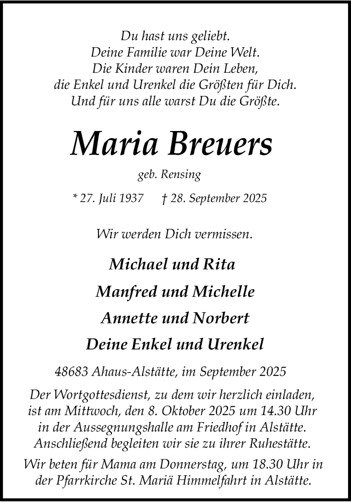 Hier finden Sie alle Traueranzeigen aus der Zeitung, die bisher für Maria Breuers erschienen sind. Weitere Traueranzeigen, die in der Zeitung erscheinen, werden hier ebenfalls aufgelistet